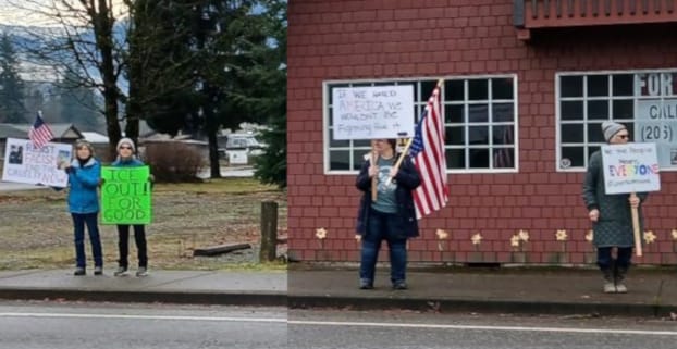 This demonstration was organized by Darrington Indivisible, an affiliate of a national broad coalition of groups defending democracy. We have meetings monthly at the library.