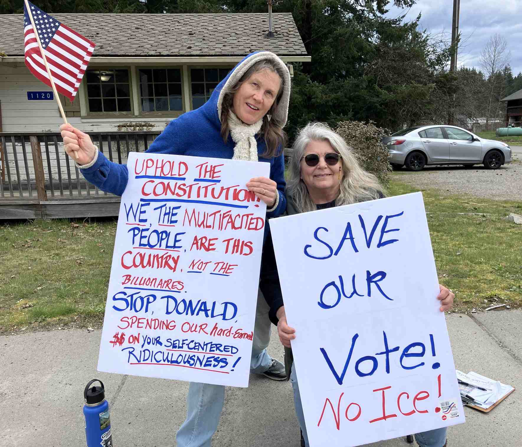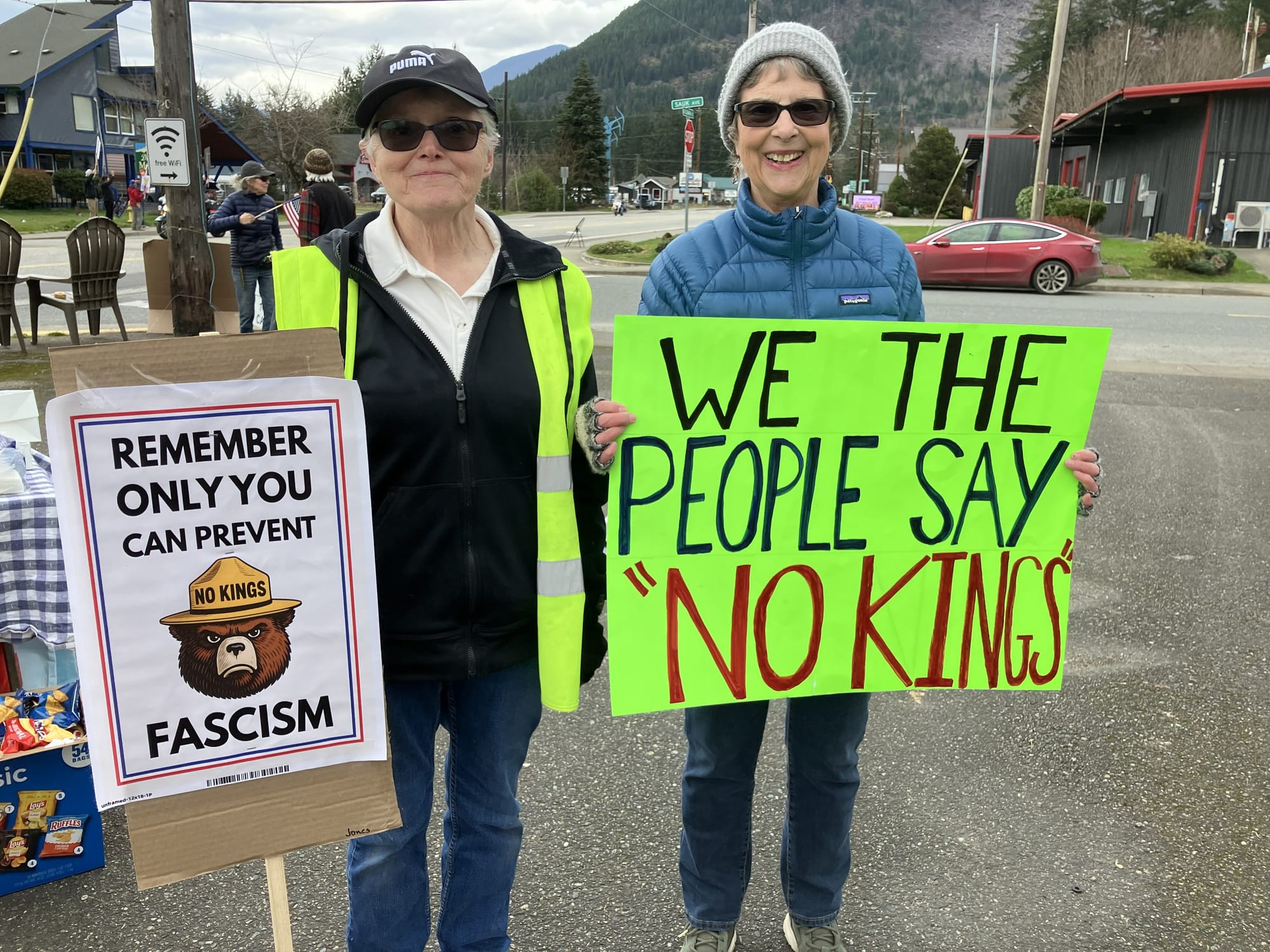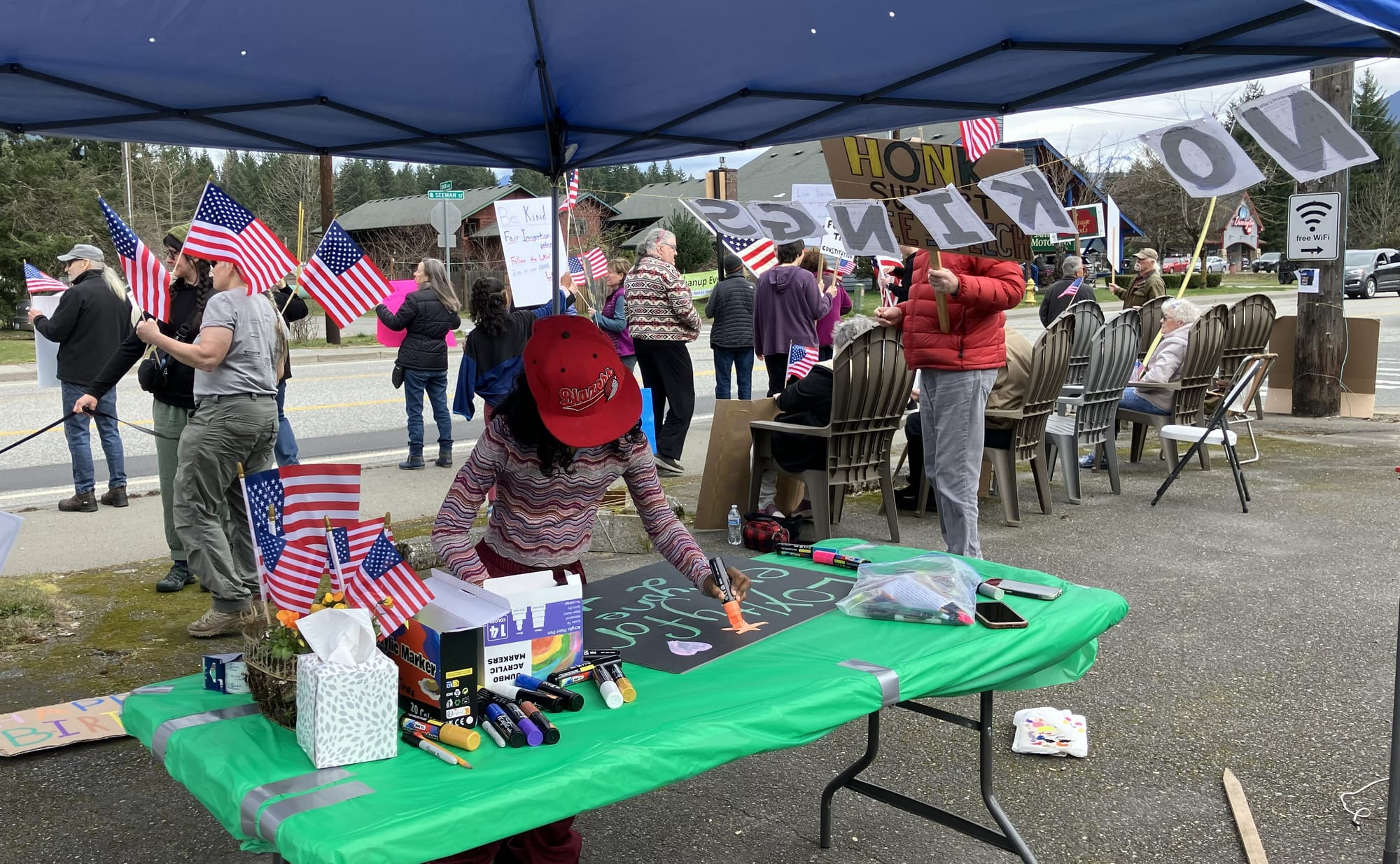 Sponsored by the local group Darrington Indivisible, young, old and inbetween enjoyed donuts and cookies, songs and flag waving, while chatting with new and old friends. And of course waving American flags and signs promoting democracy. Some of the slogans: