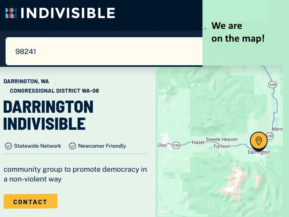 Darrington Indivisible meets the first Saturday of the month at the Darrington Library, 4 pm. All are welcome to help us find ways to act locally to support democracy and the United States Constitution.
